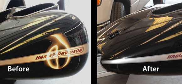 Dentmasters remove dents out of motorcycle gas tanks and fenders. We are first in the Palm Desert and Palm Springs area to offer this service. We service almost all makes and models (including Honda, Kawasaki, Suzuki, Yamaha, Aprilia, Harley Davidson, Ducati, BMW, Triumph, Norton, BSA and many more) from the newest Sport bikes and Cruisers to vintage and custom painted motorcycles.